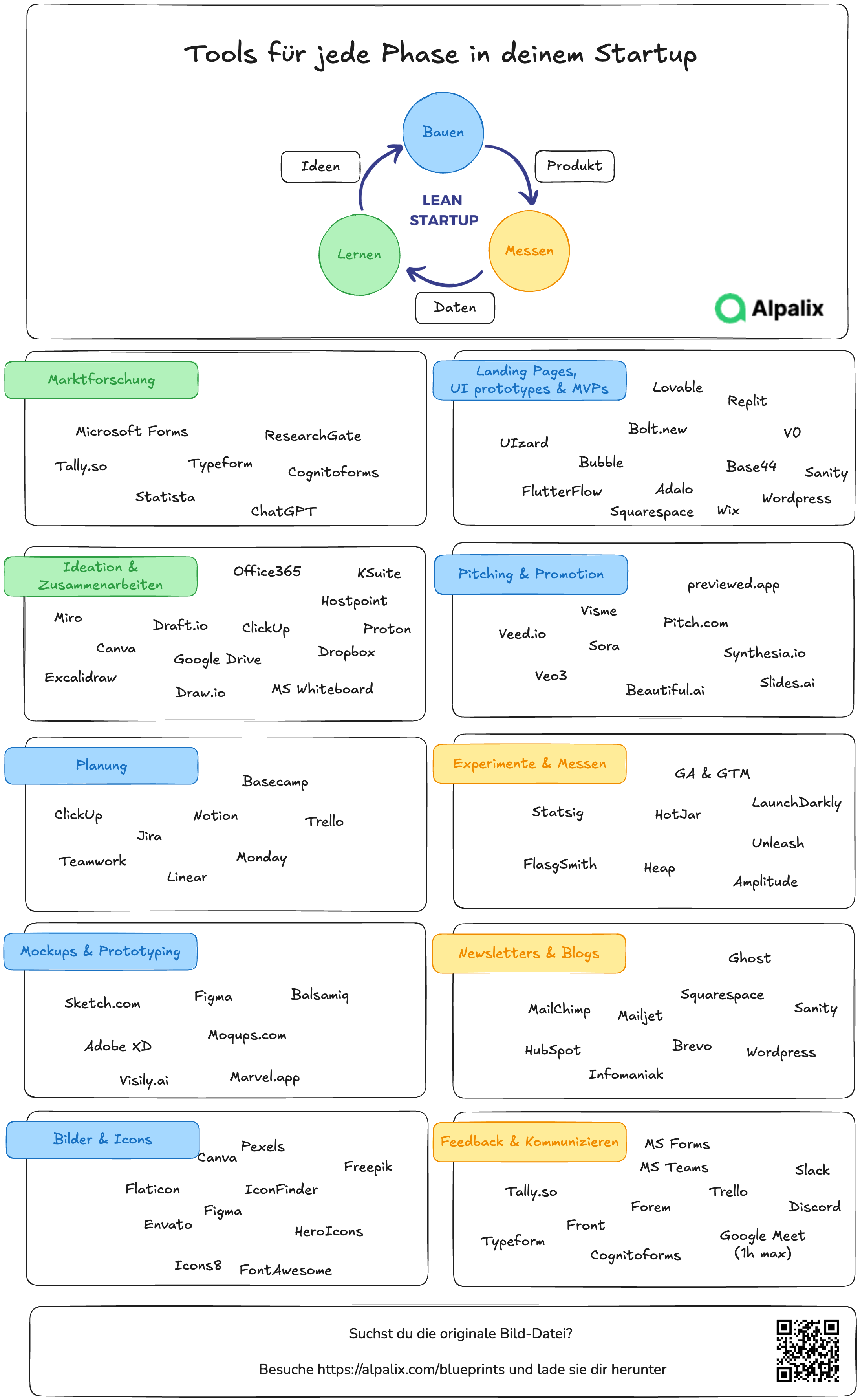 Diese Karte gibt einen Überblick, welche Tools für welchen Schritt im Lebenszyklus des Lean Startup Approach existieren.